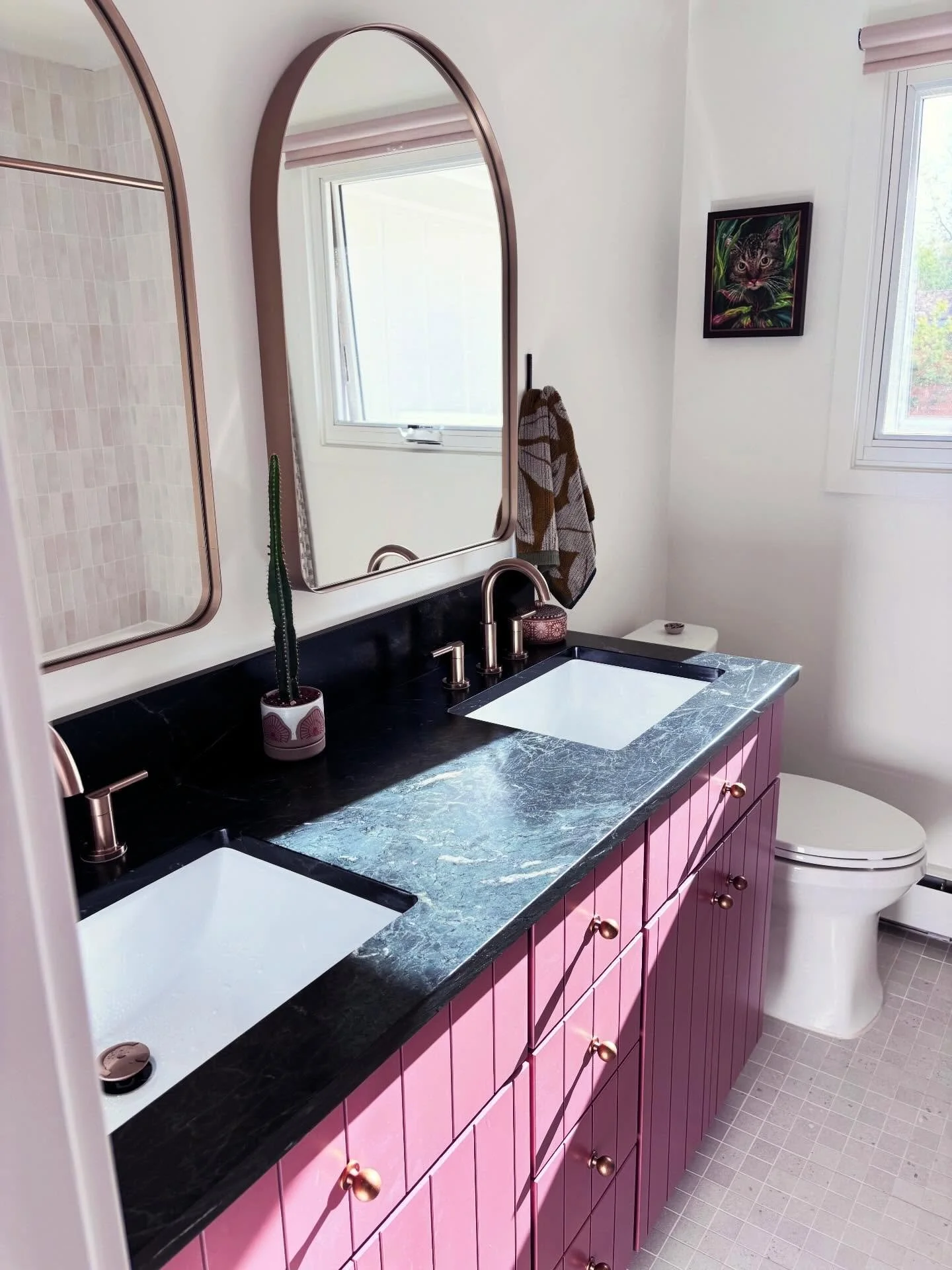 View fullsize Et voilà! This small vanity has taken months to finish. We spent copious time searching for a soapstone remnant to save on cost. At one point the vanity was stationed in our living room as we (ourselves) tore out the old piece.